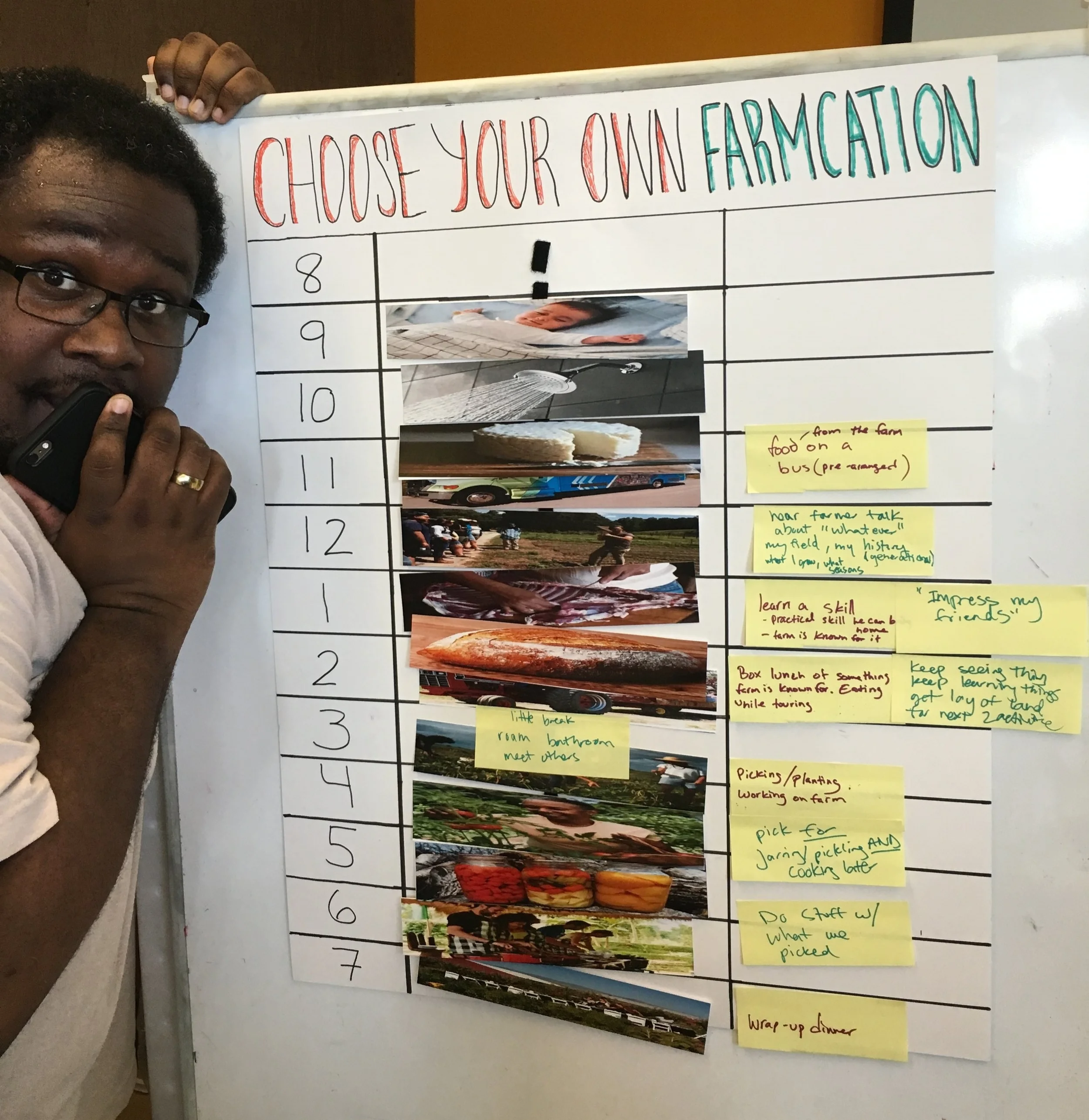 Based on our interview analysis, each team member also developed user journey maps based on the data, which we then compared and synthesized to develop a paper prototype to use in a design exercise with our classmates, who all fit the model of food-curious millennials. During this exercise, we had participants build an agenda for their ideal farmcation. Based on feedback from this exercise, and in collaboration with a farmer we met during our interviews, we designed and carried out our beta-test event.